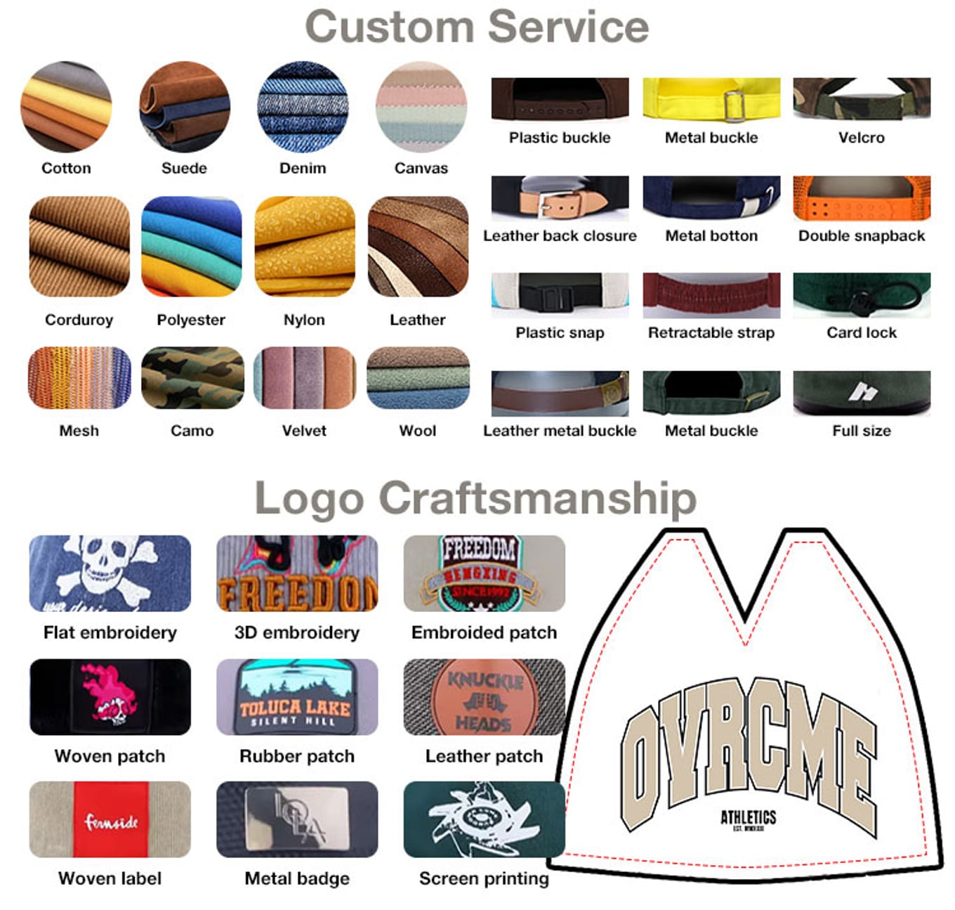 | Product type | Baseball caps, dad hats, snap on hats, truck hats, bucket hats, camping hats, fisherman hats, sun hats, knitted hats, Beanie |